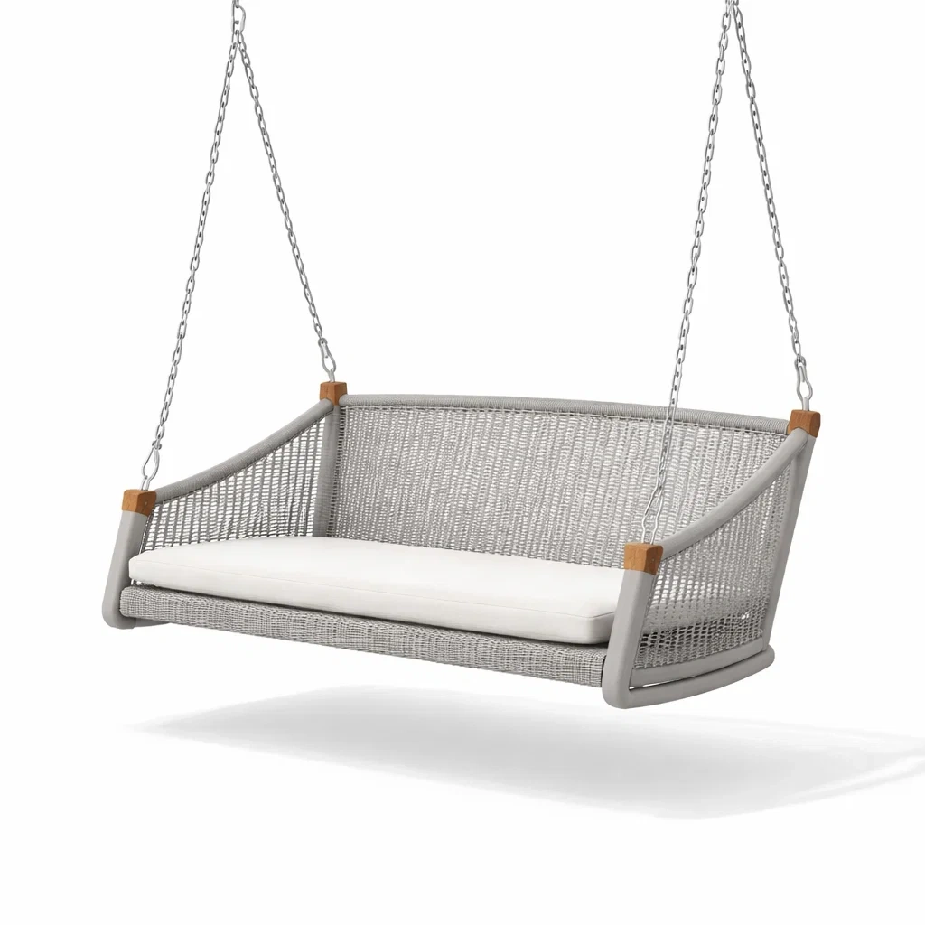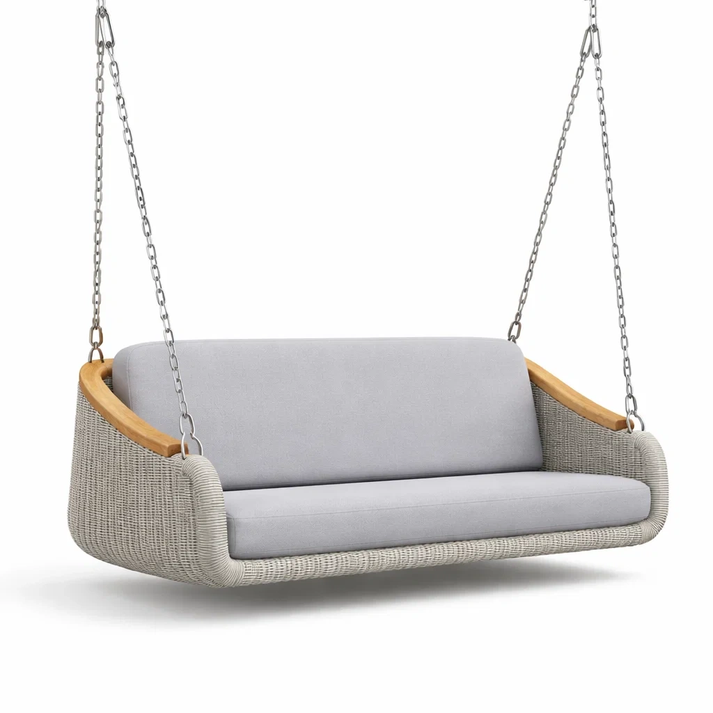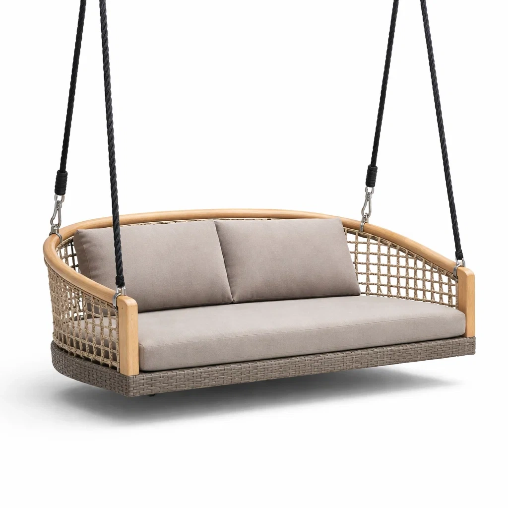 Altalena da veranda in vimini e teak con cuscini grigio chiaro
