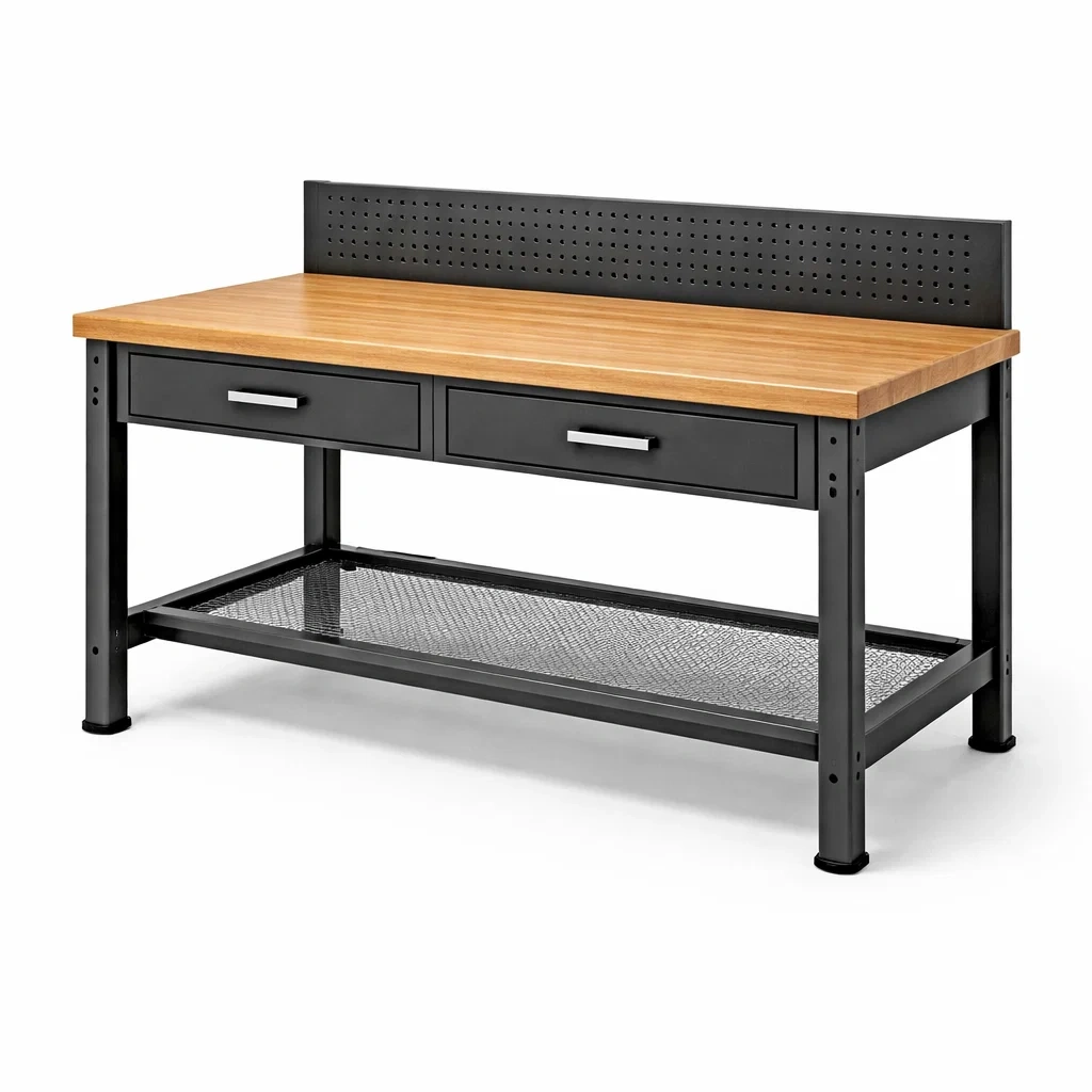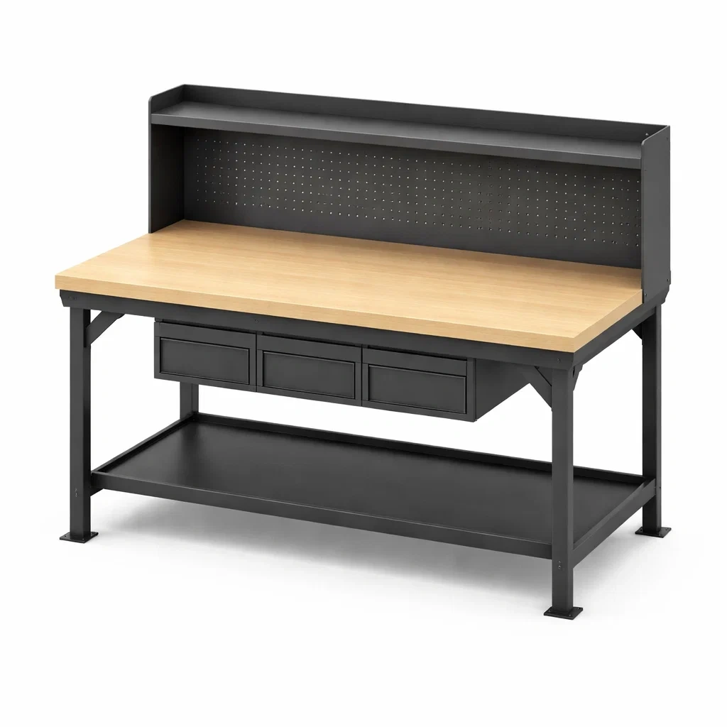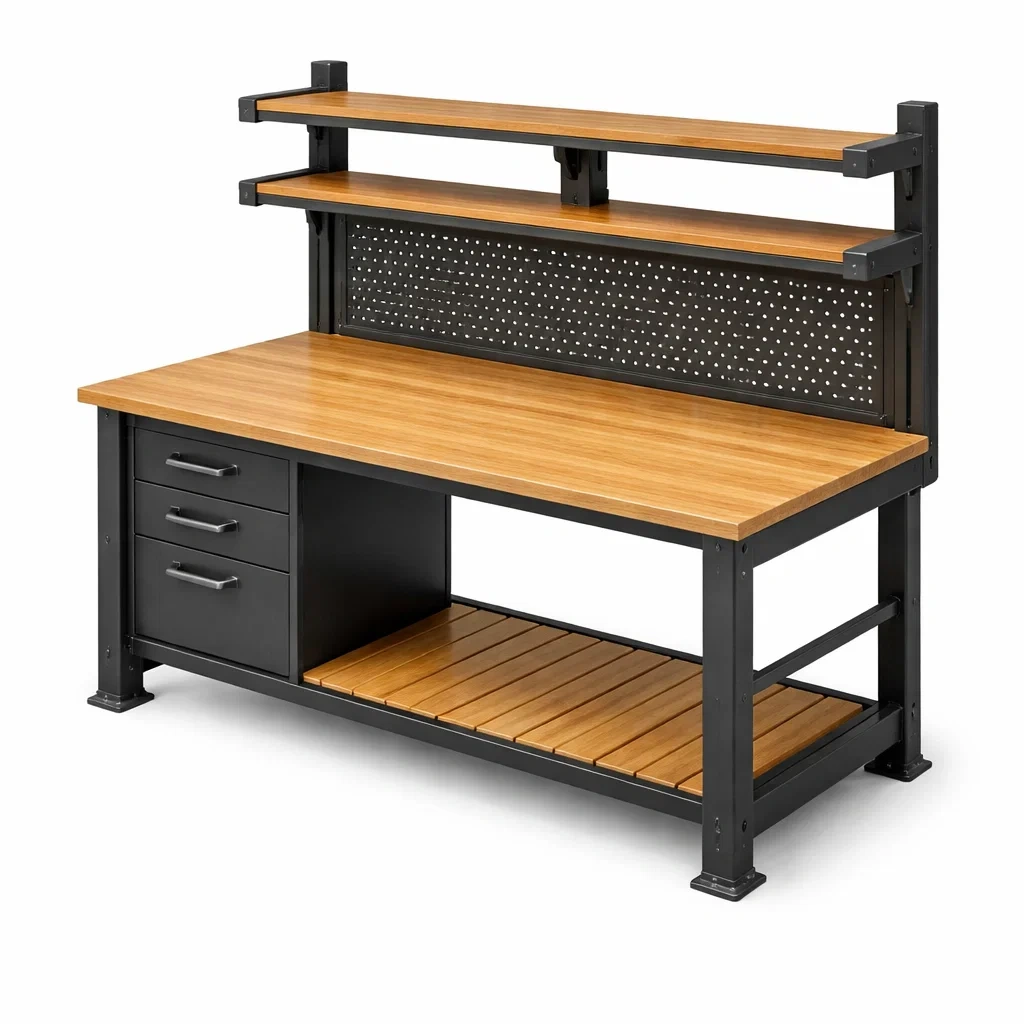 Banco da lavoro in legno e metallo con cassetti e pannello forato