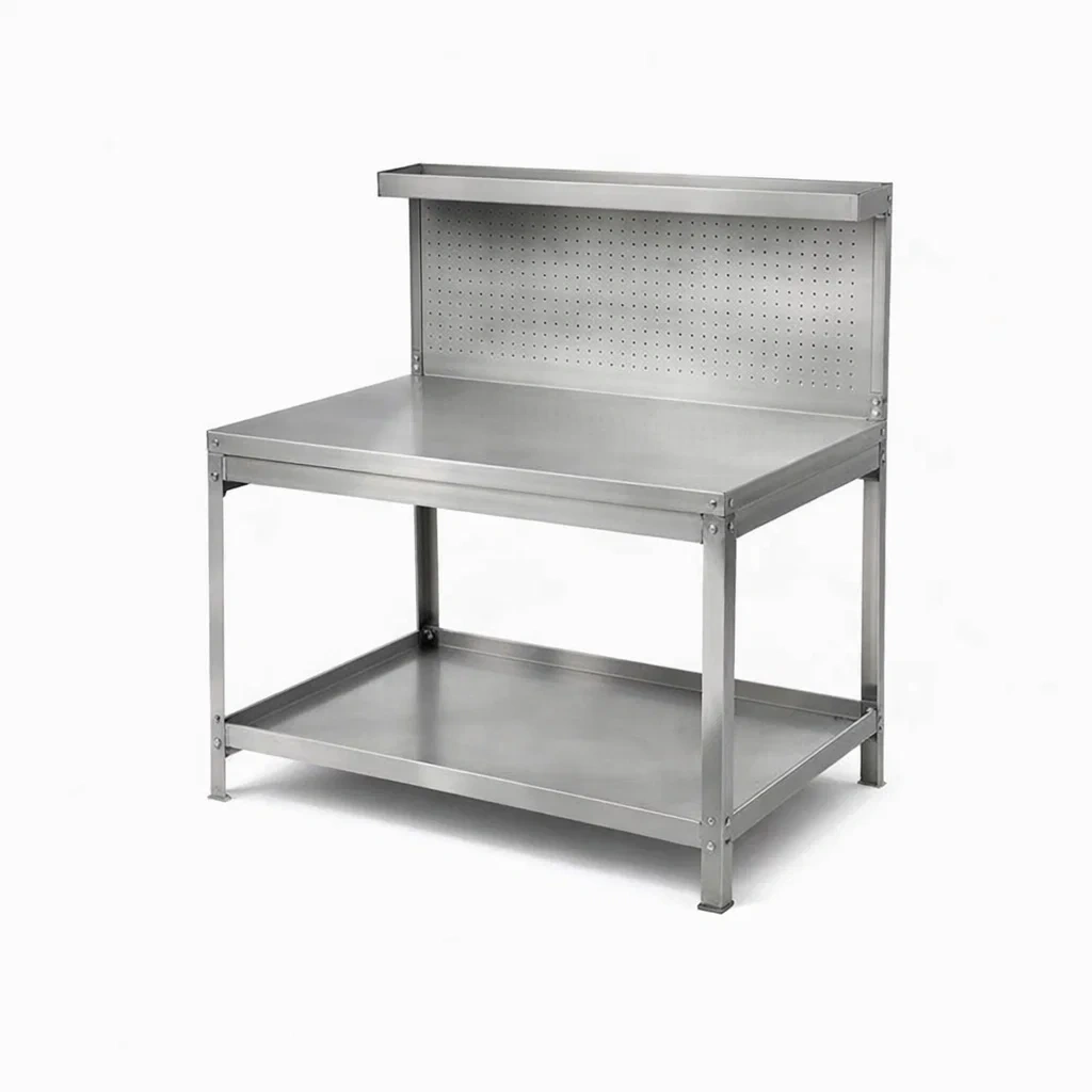 Banco da lavoro in acciaio inossidabile con mensola e pannello forato