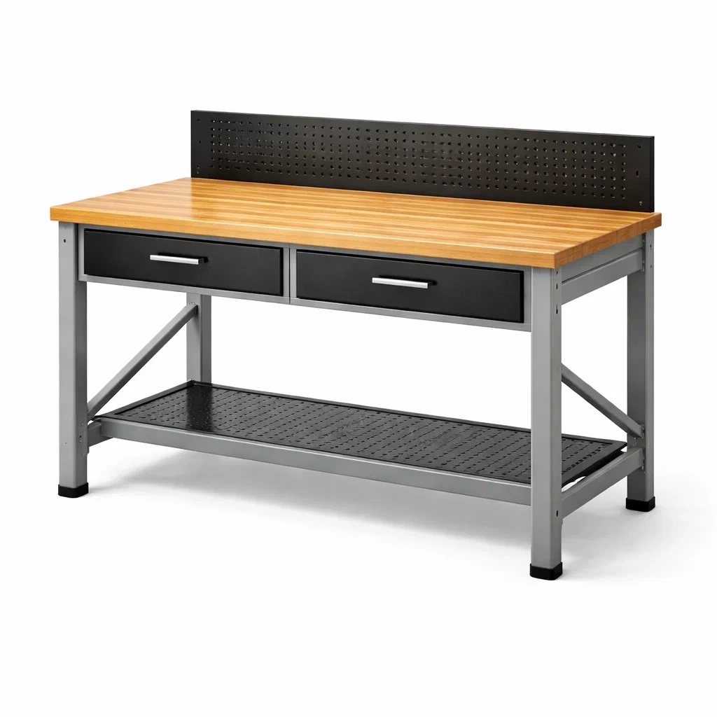 Banco da lavoro in legno e acciaio con pannello forato