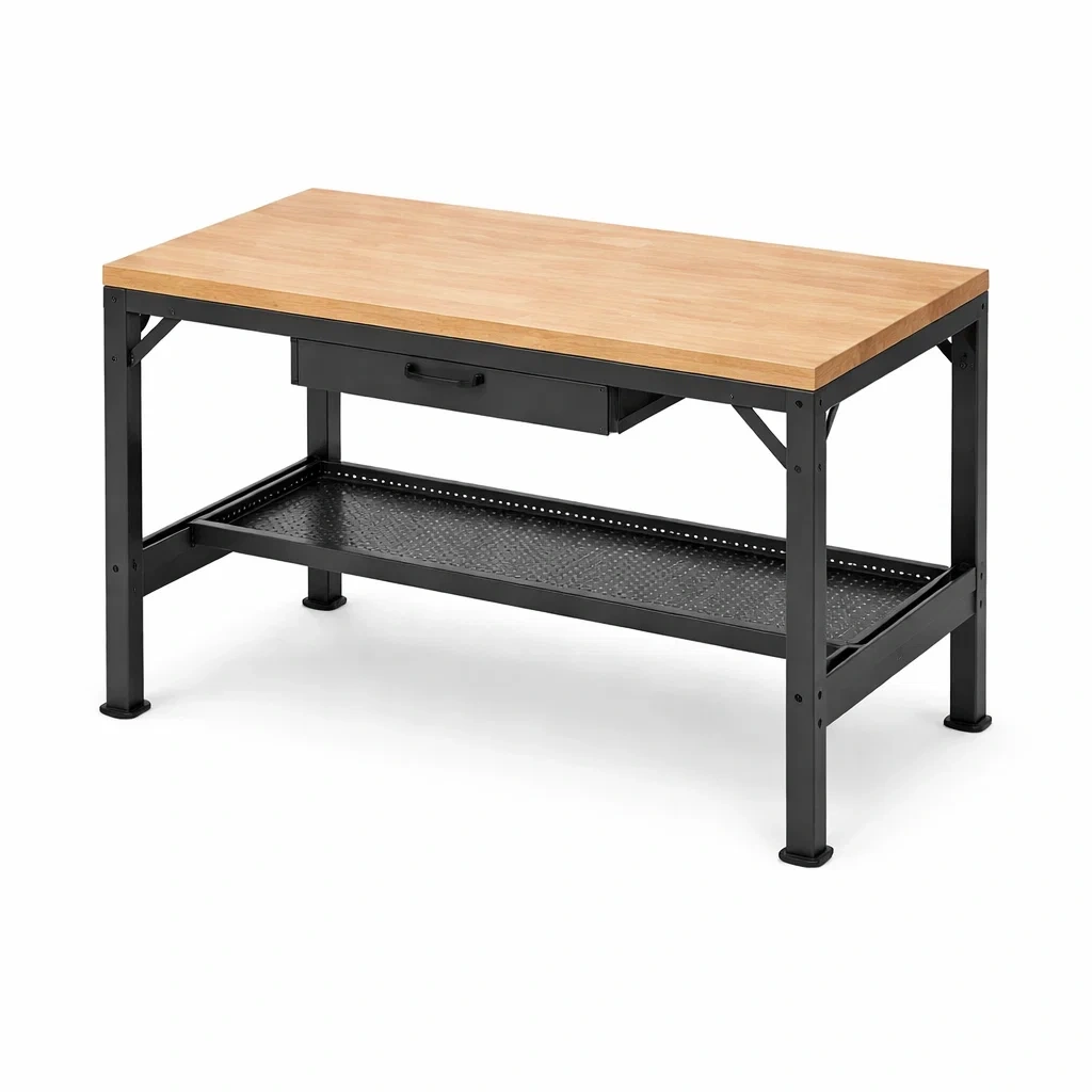 Superficie realizzata in legno di faggio, con struttura in acciaio resistente. Dimensioni del banco sono 120 cm di lunghezza, 60 cm di larghezza e 85 cm di altezza.