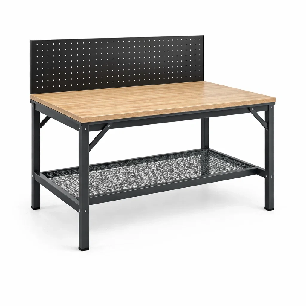 Caratteristiche: Banco da lavoro con pannello forato per appendere utensili e ripiano inferiore per spazio di archiviazione. Manutenzione: Pulire con un panno umido.