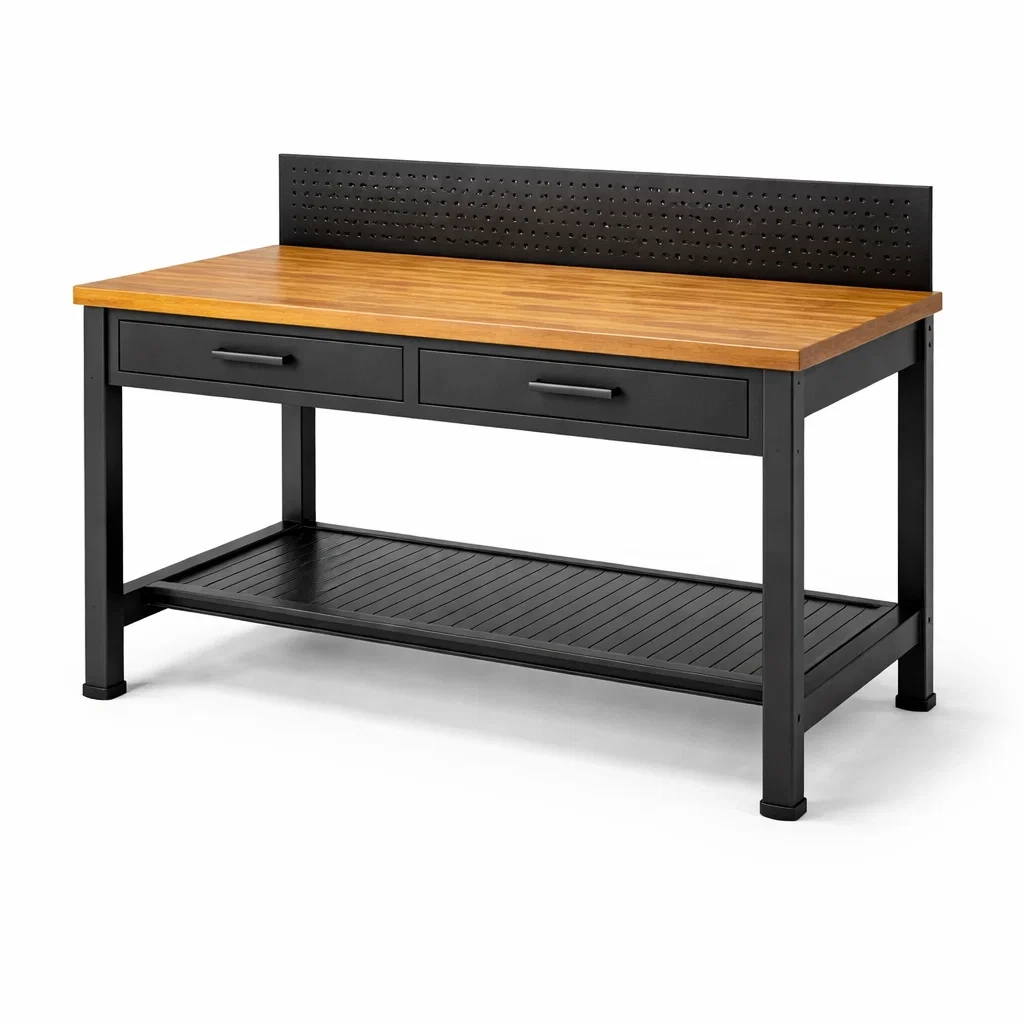Dotato di 2 cassetti, ripiano inferiore e pannellatura forata per utensili.