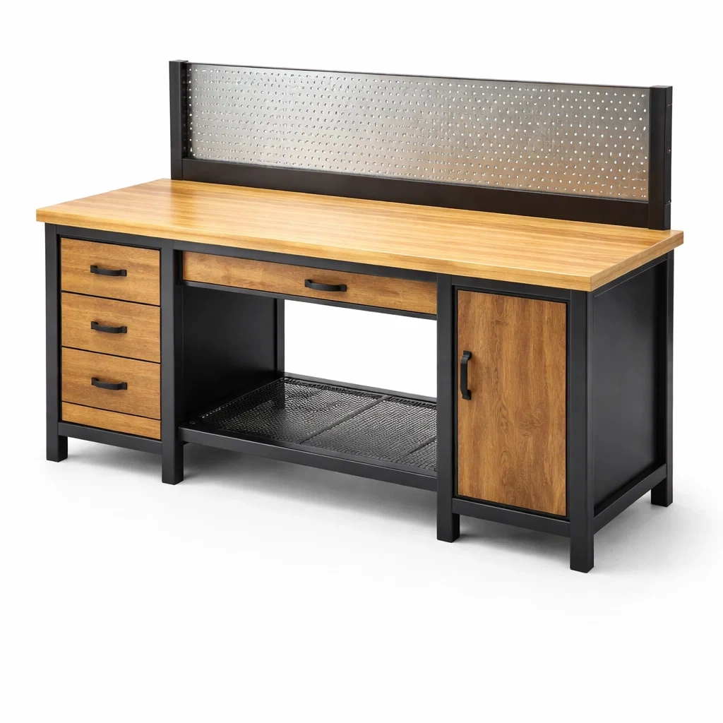 Materiale: Piano in MDF, struttura in acciaio, pannello in metallo perforato