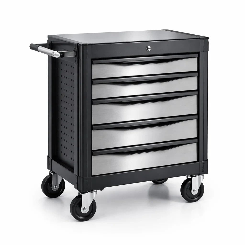 Il carrello portautensili è progettato con un corpo robusto in acciaio inox per garantire durata. Dispone di 5 cassetti con guide scorrevoli per un'operazione agevole. La superficie è rifinita con verniciatura a polvere per protezione dalla ruggine.