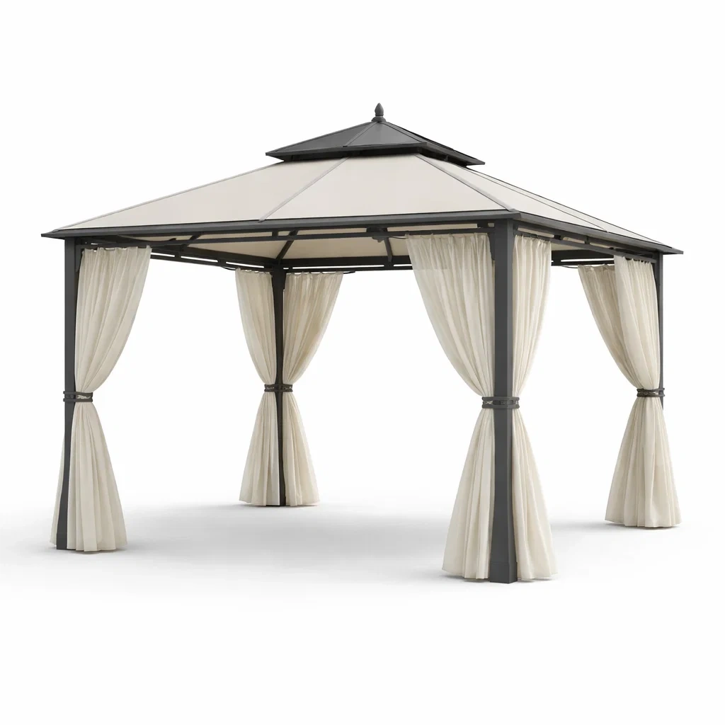 Materiali: struttura in alluminio, telo del tetto in poliestere, tende in poliestere.
