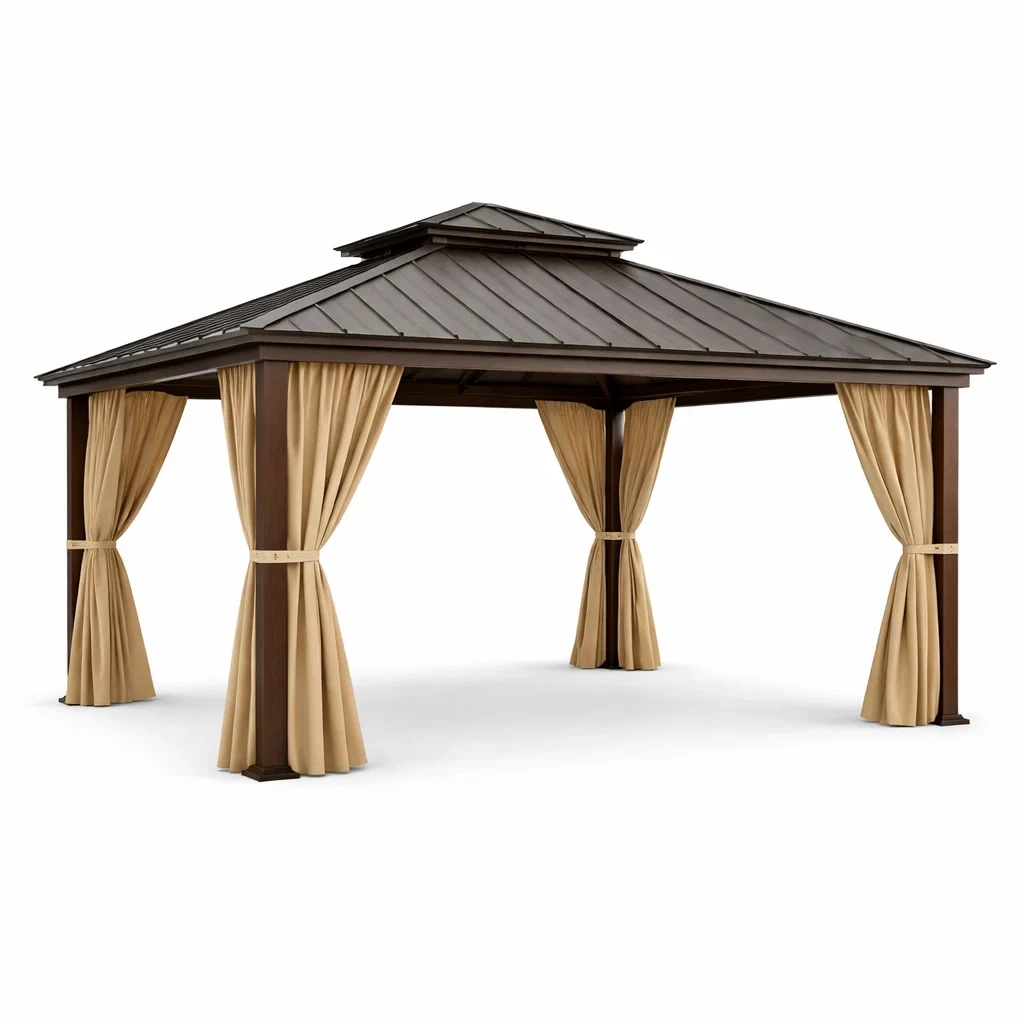 Questo gazebo è dotato di una struttura in alluminio e un tetto in acciaio resistente. Le tende sono realizzate in poliestere di alta qualità. Le dimensioni totali del gazebo sono 300 cm di lunghezza, 400 cm di profondità e 270 cm di altezza. I pilastri misurano 10 cm di larghezza. Il colore della struttura è marrone, mentre le tende sono di colore beige. La forma è rettangolare con un tetto a doppia falda. Il gazebo offre impermeabilità e alta resistenza ai raggi UV. Sono inclusi i ganci per le tende.