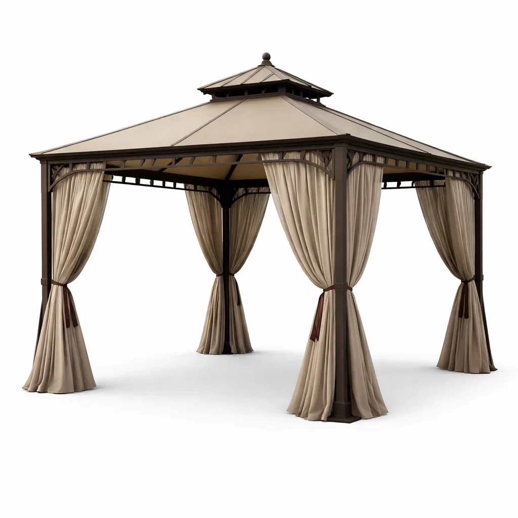 Il gazebo è dotato di un tetto ventilato che assicura una migliore circolazione dell'aria e tende laterali per maggiore privacy.